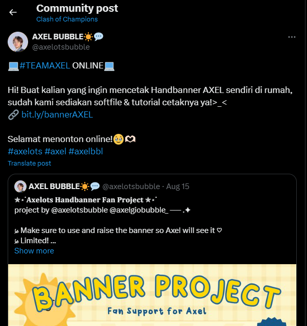 Diharapkan lewat proyek ini dukungan Axelots dapat tersampaikan kepada Axel dan dengan adanya proyek kolaborasi dapat semakin memeriahkan final CoC.